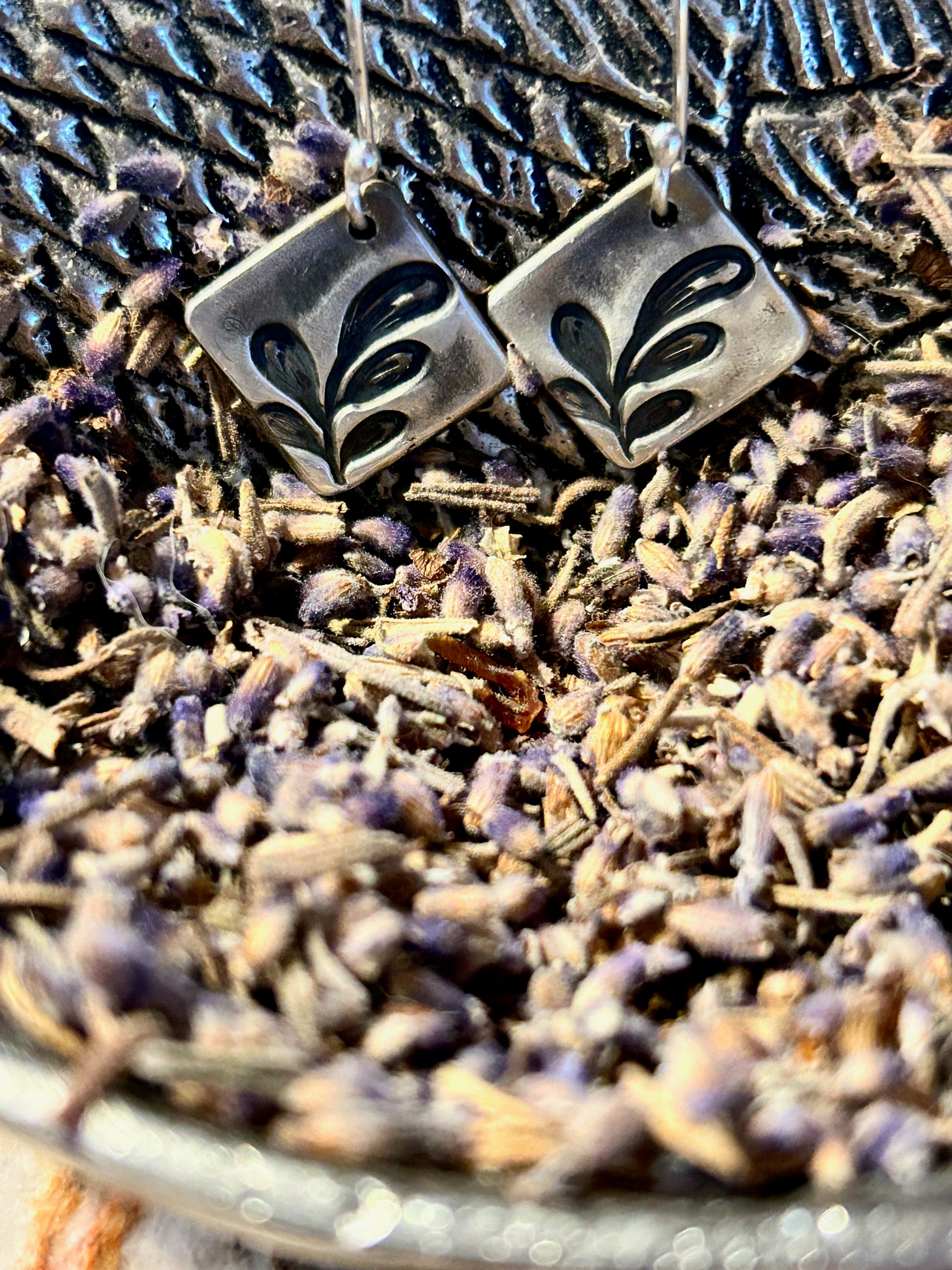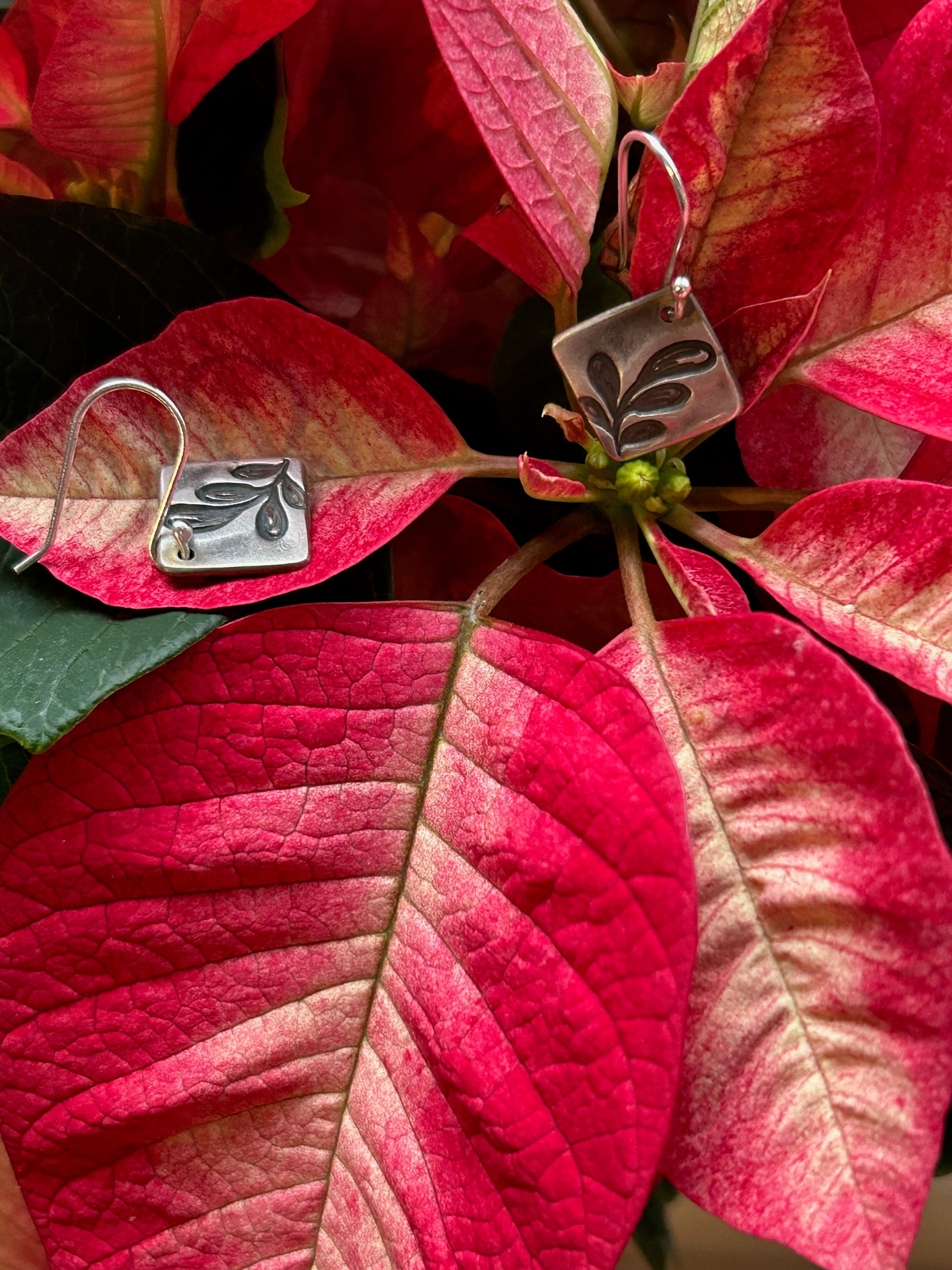 Hand-crafted pure silver earrings featuring small triangle drops stamped with a simple tulip-like botanical design. Light, organic, and perfect for everyday wear.