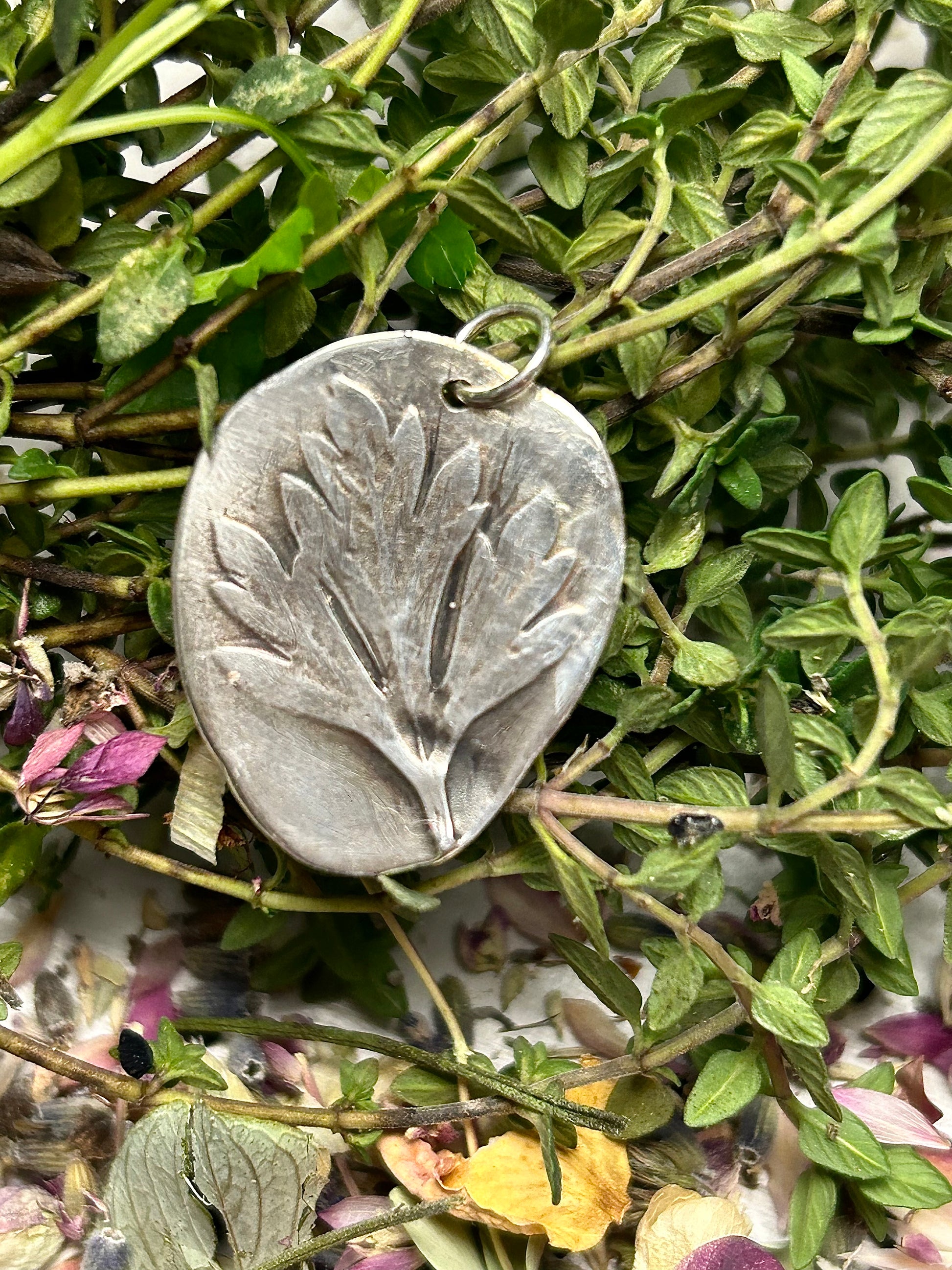 "Garden Essence" Pendant, this Pure Silver Italian parsley leaf was captured using a parsley leaf from my garden, a culinary staple and symbol of freshness.