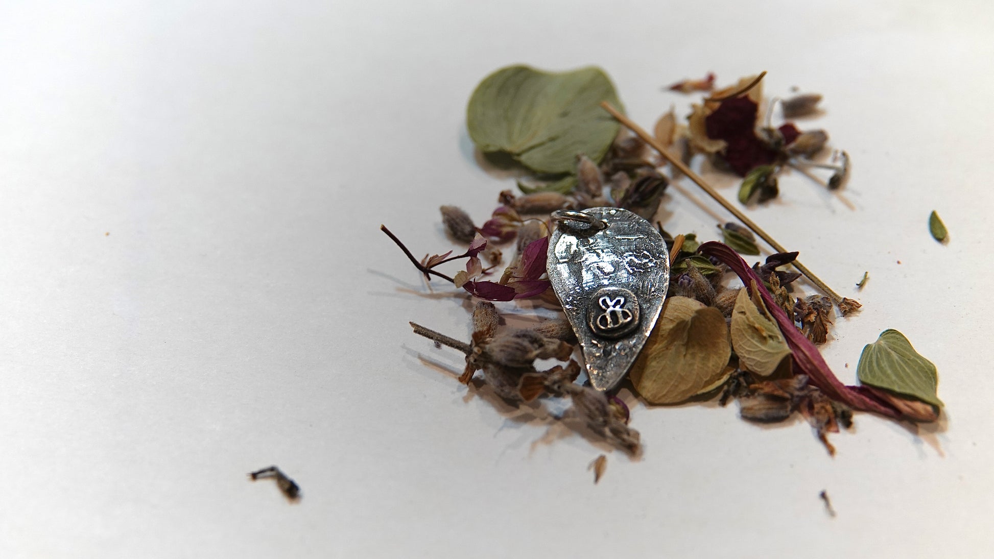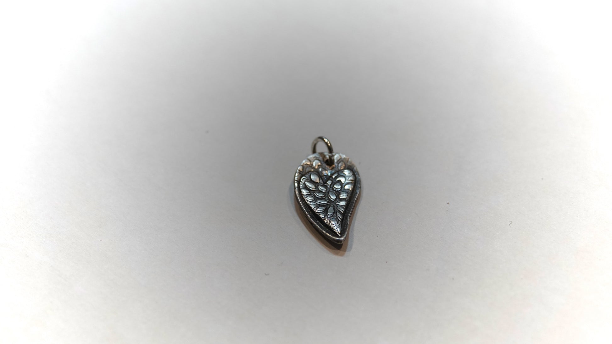 The "Heart of Blossoms Pendant" is a pure silver piece showcasing a raised floral design within a heart shape. This tiny pendant blends the delicate beauty of flora with the timeless symbol of love. The flip side of the heard holds a tiny raised bee.