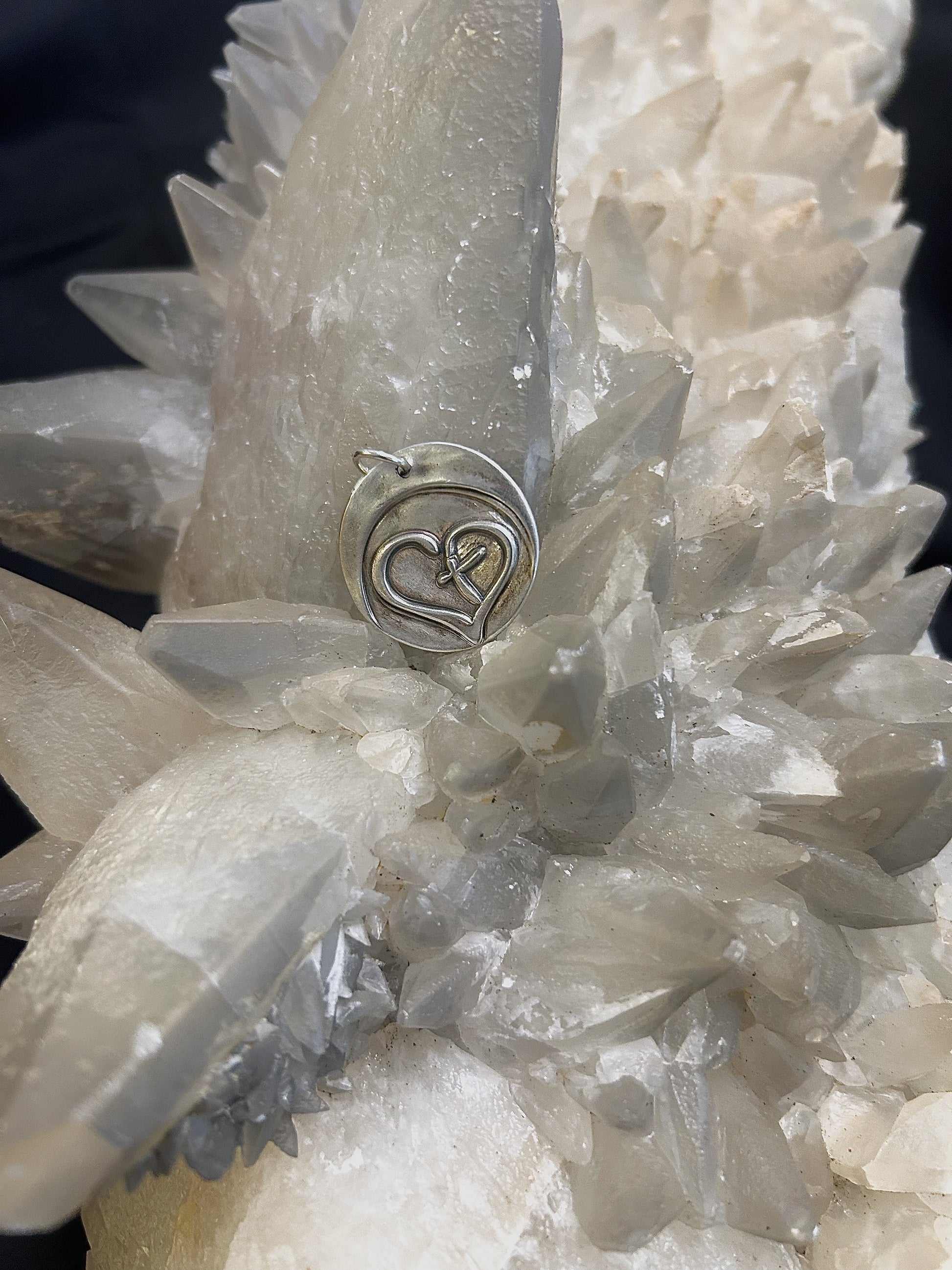 This elegant pendant features a beautifully crafted heart intertwined with a simple cross — a timeless symbol of love and faith, made of fine silver. The pendant rests on a smooth oval backing, giving it a unique layered look with subtle depth and texture.