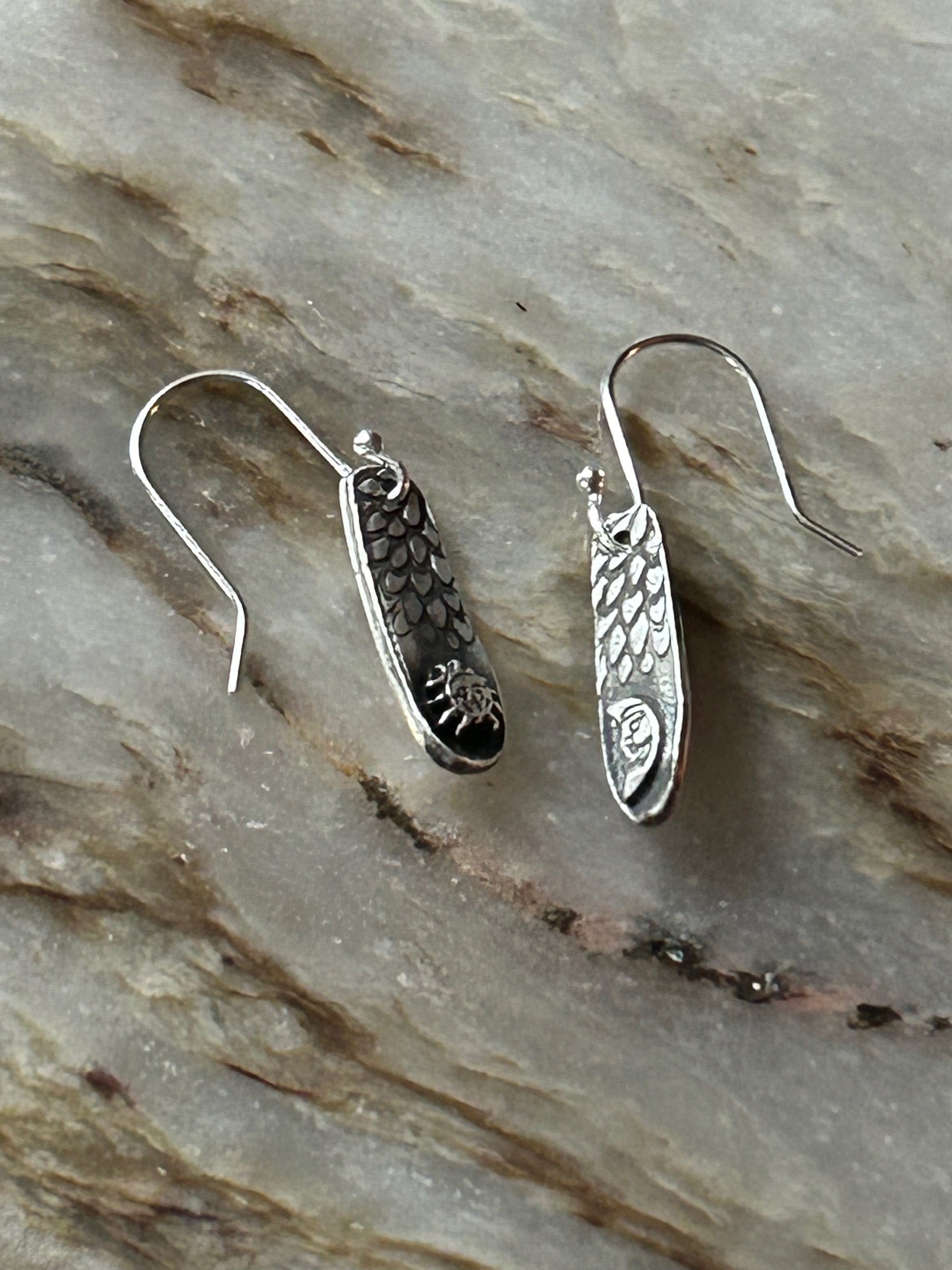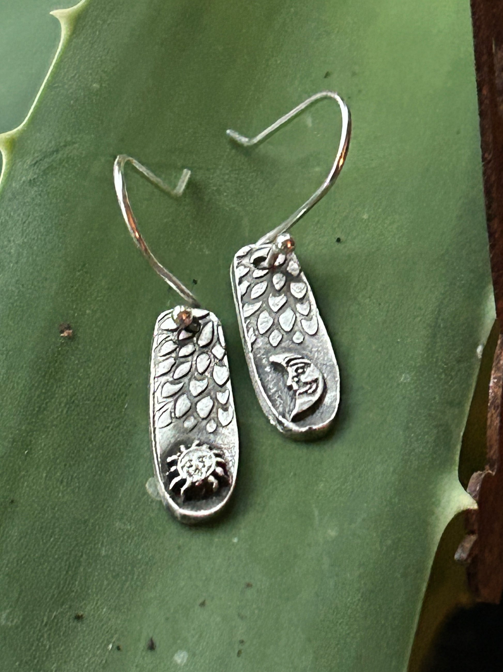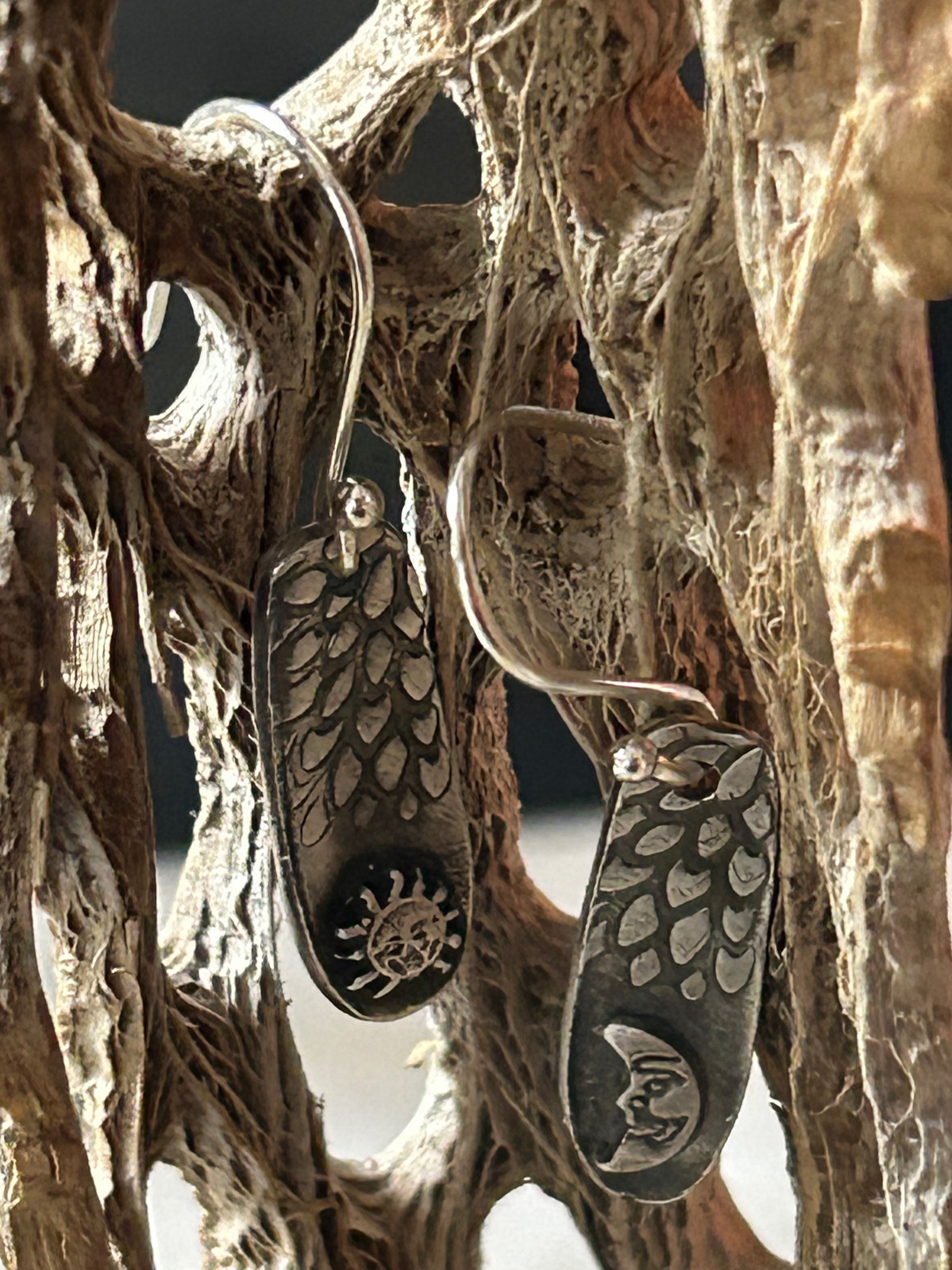 "Lunar Solstice" These charming artisan fine silver earrings features a harmonious arrangement of celestial symbols: a crescent moon on one earring, and a radiant sun on the other, each delicately crafted to catch the light.