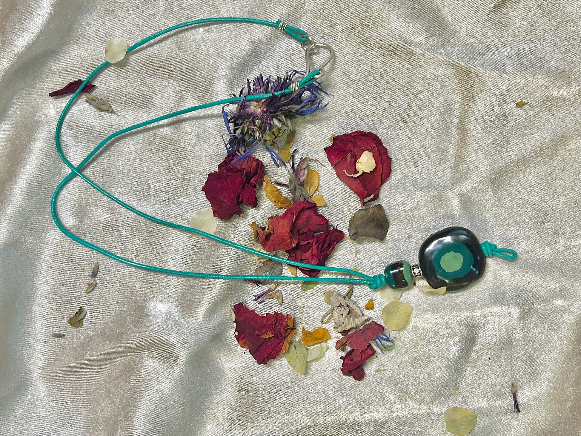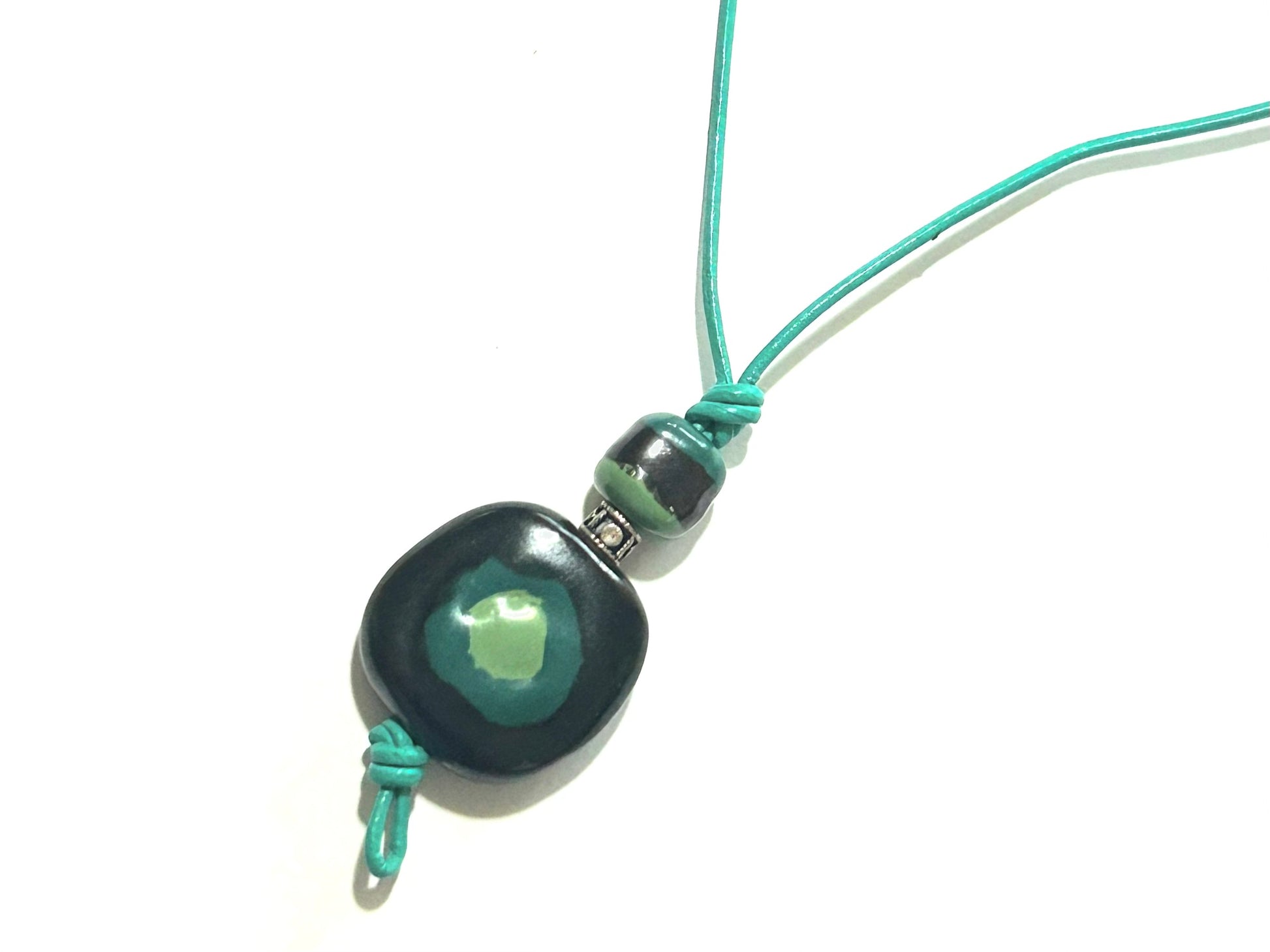 This is a vibrant leather necklace featuring a glossy ceramic pendant in rich green tones, with a layered, organic pattern resembling natural stone. The pendant is paired with a matching ceramic bead and a silver spacer for a touch of contrast. The teal leather cord complements the pendant's colors, tied with secure knots for an artisanal, boho-chic style. The minimalist design highlights the pendant’s unique textures and colors.