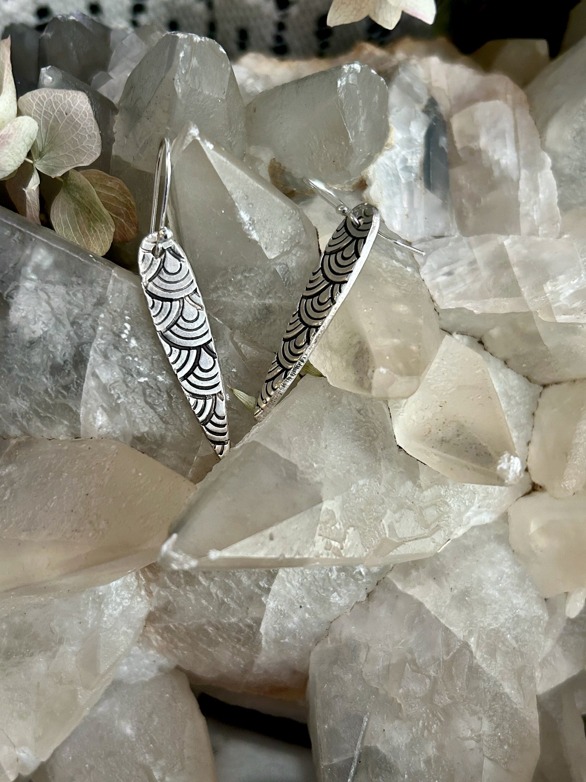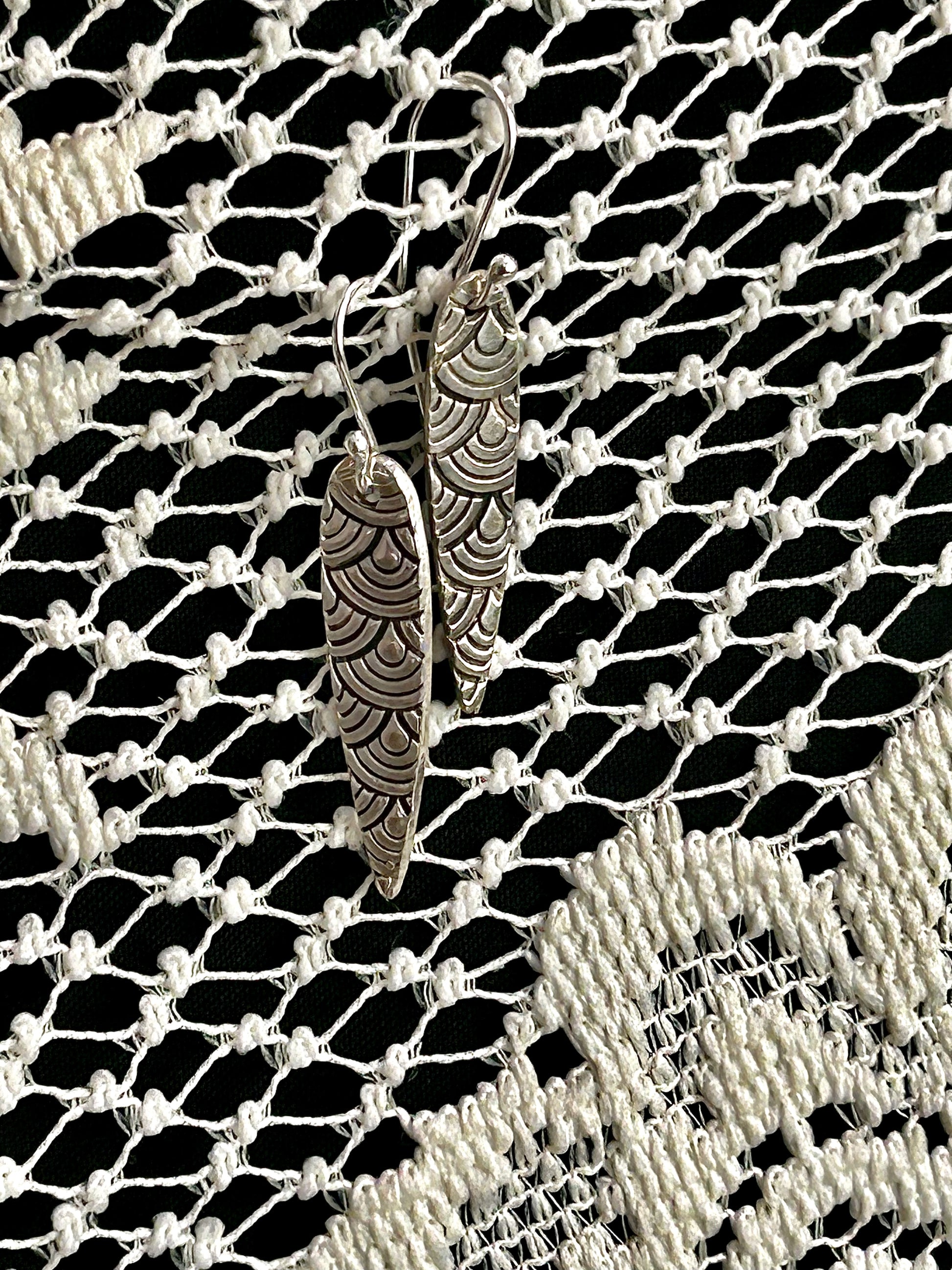 These hand crafted fine silver earrings feature an elongated design with intricate wave patterns. Lightweight and stylish, they're perfect for adding a touch of poise to any look.