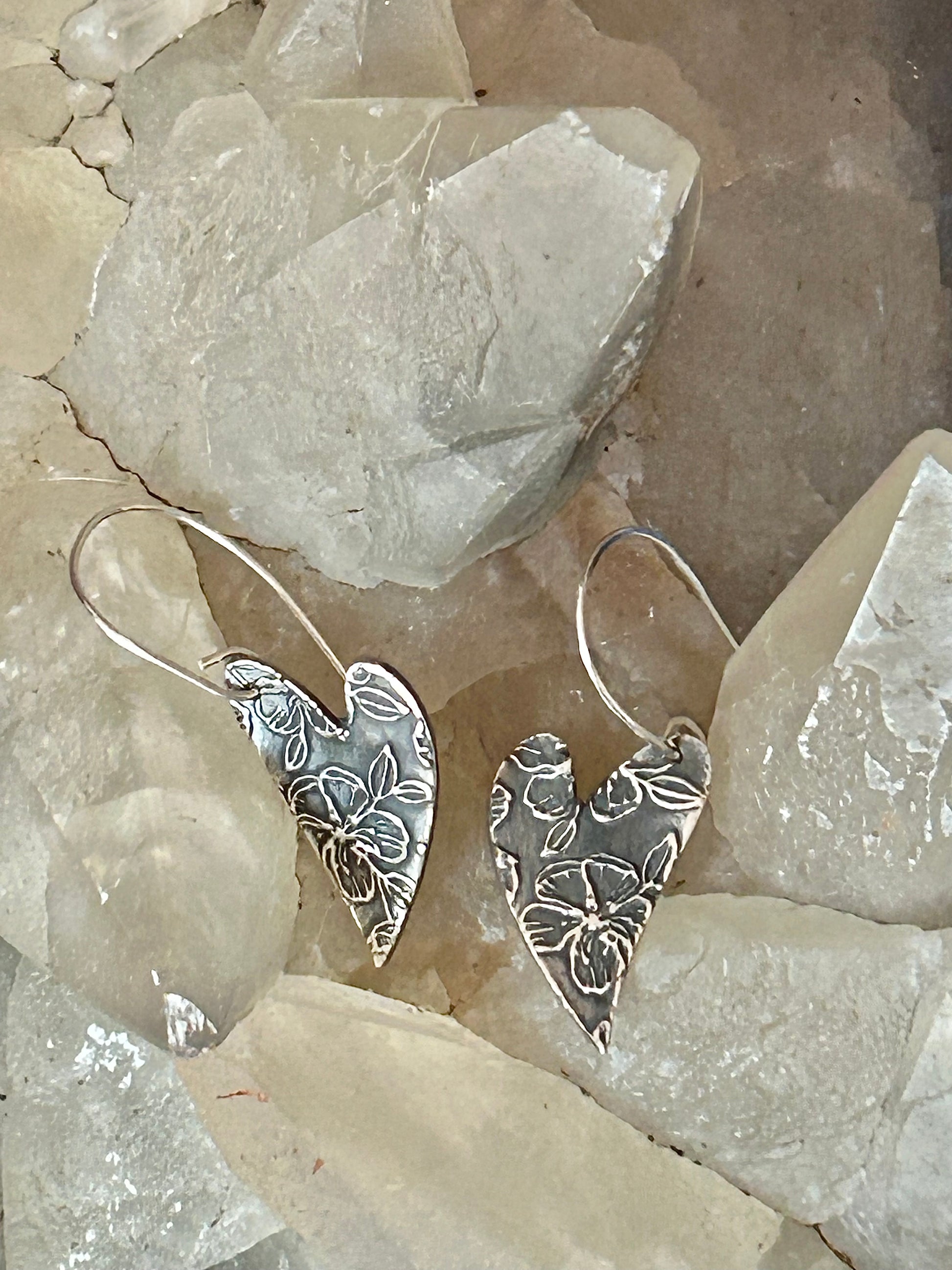 These pure silver heart-shaped earrings feature a raised floral impression that captures the essence of spring's first blooms. Designed for the romantic at heart, these pieces blend art with nature, creating a perfect harmony that complements any style.